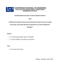 Álvarez Saborío, Erick Santiago and Torres Aguirre, Eliezer Rigoberto (2023) Análisis de los aspectos técnicos más relevantes para evaluar el uso de la energía termo solar, como fuente alternativa de generación en la matriz energética de Nicaragua. Other thesis, Universidad Nacional de Ingeniería.