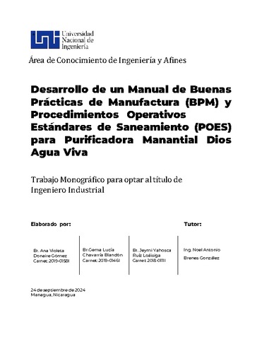 Donaire Gómez, Ana Violeta and Chavarría Blandón, Gema Lucía and Ruíz Loáisiga, Jeymi Yahosca (2024) Desarrollo de un Manual de Buenas Prácticas de Manufactura (BPM) y Procedimientos Operativos Estándares de Saneamiento (POES) para Purificadora Manantial Dios Agua Viva. Other thesis, Universidad Nacional de Ingeniería.