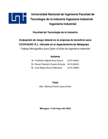 Cuadra Estrada, Daniel Salomón and García Mendoza, José Miguel and Ruiz García, Cristhofer Gabriel (2024) Evaluación de riesgo laboral en la empresa de beneficio seco COOPAGRO R.L. Ubicada en el departamento de Matagalpa. Other thesis, Universidad Nacional de Ingeniería.