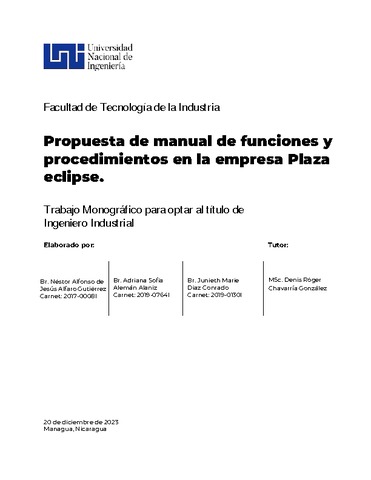 Alfaro Gutiérrez, Néstor Alfonso de Jesús and Alemán Alaniz, Adriana Sofia and Diaz Conrado, Junieth Marie (2023) Propuesta de manual de funciones y procedimientos en la empresa Plaza eclipse. Other thesis, Universidad Nacional de Ingeniería.