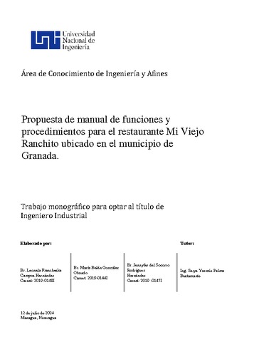 Campos Hernández, Leonela Francheska and González Obando, María Belén and Rodríguez Hernández, Jennyfer del Socorro (2024) Propuesta de manual de funciones y procedimientos para el restaurante Mi Viejo Ranchito ubicado en el municipio de Granada. Other thesis, Universidad Nacional de Ingeniería.