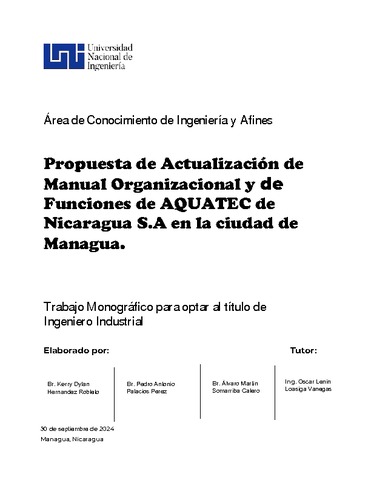 Hernández Robleto, Kerry Dylan and Palacios Pérez, Pedro Antonio and Somarriba Calero, Álvaro Martin (2024) Propuesta de Actualización de Manual Organizacional y de Funciones de AQUATEC de Nicaragua S.A en la ciudad de Managua. Other thesis, Universidad Nacional de Ingeniería.