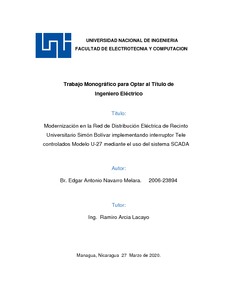 Navarro Melara, Edgar Antonio (2020) Modernización en la Red de Distribución Eléctrica de Recinto Universitario Simón Bolívar implementando interruptor Tele controlados Modelo U-27 mediante el uso del sistema SCADA. Other thesis, Universidad Nacional de Ingeniería.