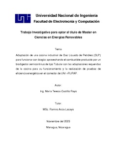 Castillo Rayo, María Teresa (2023) Adaptación de una cocina industrial de Gas Licuado de Petróleo (GLP) para funcionar con biogás aprovechando el combustible producido por un biodigestor semicontinuo de tipo Tubular con las adaptaciones requeridas de la cocina para su funcionamiento y la realización de pruebas de eficiencia energética en el comedor de UNI –RUPAP. Masters thesis, Universidad Nacional de Ingeniería.
