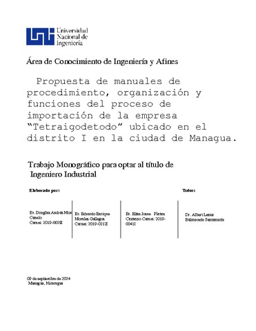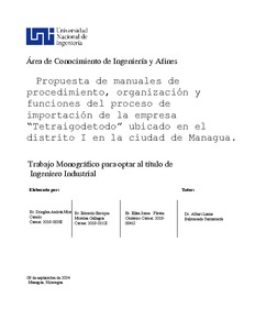 Montes Canelo, Douglas Andrés and Morales Gallegos, Eduardo Enrique and Fletes Centeno, Elías Josue (2024) Propuesta de manuales de procedimiento, organización y funciones del proceso de importación de la empresa “Tetraigodetodo” ubicado en el distrito I en la ciudad de Managua. Other thesis, Universidad Nacional de Ingeniería.