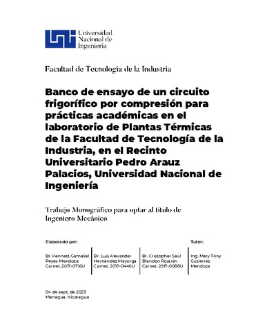 Reyes Mendoza, Kennett Gamaliel and Hernández Mayorga, Luis Alexander and Blandón Rostrán, Cristopher Saúl (2023) Banco de ensayo de un circuito frigorífico por compresión para prácticas académicas en el laboratorio de Plantas Térmicas de la Facultad de Tecnología de la Industria, en el Recinto Universitario Pedro Arauz Palacios, Universidad Nacional de Ingeniería. Other thesis, Universidad Nacional de Ingeniería.