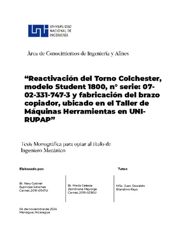 Espinoza Sánchez, Nery Gabriel and Zambrana Mayorga, María Celeste (2024) Reactivación del Torno Colchester, modelo Student 1800, n° serie: 0702-331-747-3 y fabricación del brazo copiador, ubicado en el Taller de Máquinas Herramientas en UNI-RUPAP. Other thesis, Universidad Nacional de Ingeniería.