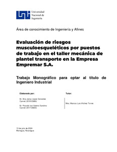 López González, Ana Jancy and Valerio Sandino, Ricardo Isaí (2024) Evaluación de riesgos musculoesqueléticos por puestos de trabajo en el taller mecánica de plantel transporte en la Empresa Empremar S.A. Other thesis, Universidad Nacional de Ingeniería.
