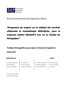 López Martínez, Sophia Alejandra and Ramírez Pineda, Isaac José and Rodríguez Blandón, Lionar Alexander (2024) Propuesta de mejora en la calidad del servicio utilizando la metodología SERVQUAL, para la empresa LEMAT SECURITY S.A. en la ciudad de Matagalpa. Other thesis, Universidad Nacional de Ingeniería.