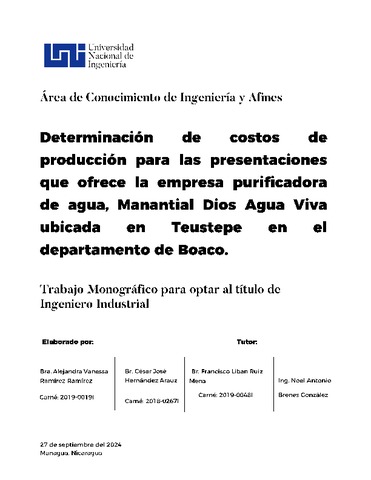 Ramírez Ramírez, Alejandra Vanessa and Hernández Arauz, Cesar José and Ruiz Mena, Francisco Liban (2024) Determinación de costo de producción para las presentaciones que ofrece la empresa purificadora de agua, Manantial Dios Agua Viva ubicada en Teustepe en el departamento de Boaco. Other thesis, Universidad Nacional de Ingeniería.