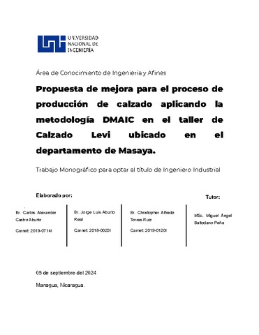 Castro Aburto, Carlos Alexander and Aburto Real, Jorge Luis and Torres Ruiz, Christopher Alfredo (2024) Propuesta de mejora para el proceso de producción de calzado aplicando la metodología DMAIC en el taller de Calzado Levi ubicado en el departamento de Masaya. Other thesis, Universidad Nacional de Ingeniería.