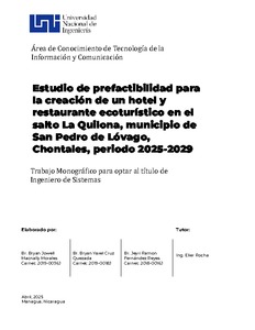 Macnally Morales, Bryan Jowell and Cruz Quezada, Bryan Yaxel and Fernández Reyes, Jeyri Ramón (2025) Estudio de prefactibilidad para la creación de un hotel y restaurante ecoturístico en el salto La Quilona, municipio de San Pedro de Lóvago, Chontales, periodo 2025-2029. Other thesis, Universidad Nacional de Ingeniería.