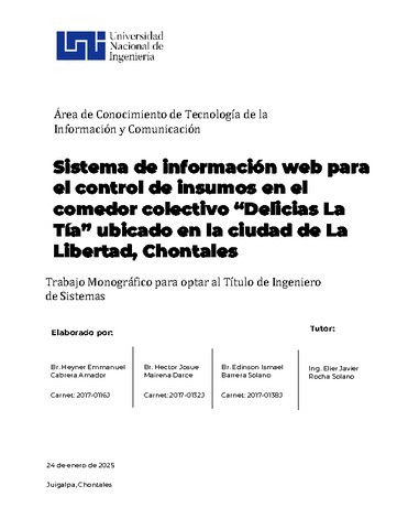 Cabrera Amador, Heyner Emmanuel and Mairena Darce, Héctor Josué and Barrera Solano, Edinson Ismael (2025) Sistema de información web para el control de insumos en el comedor colectivo “Delicias La Tía” ubicado en la ciudad de La Libertad, Chontales. Other thesis, Universidad Nacional de Ingeniería.