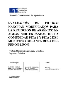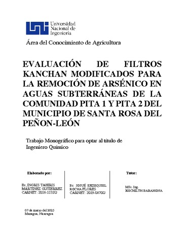 Martínez Gutiérrez, Ingris Tahiris and Rocha Flores, Josué Exzequiel (2025) Evaluación de filtros kanchan modificados para la remoción de arsénico en aguas subterráneas de la comunidad Pita 1 y Pita 2 del municipio de Santa Rosa del Peñon-León. Other thesis, Universidad Nacional de Ingeniería.