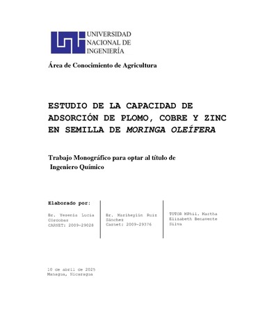 Córdobas, Yesenia Lucia and Ruiz Sánchez, Mariheylin (2025) Estudio de la capacidad de adsorción de plomo, cobre y zinc en semilla de moringa oleífera. Other thesis, Universidad Nacional de Ingeniería.