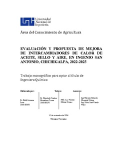 Luna, Edith Lizamar and Montalván Torres, Elizabeth Cristina (2024) Evaluación y propuesta de mejora de intercambiadores de calor de aceite, sello y aire, en ingenio San Antonio, Chichigalpa, 2022-2023. Other thesis, Universidad Nacional de Ingeniería.