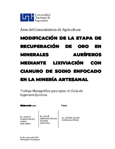 Reyes Garay, Ashley Gimena and Rojas Pilarte, Josué Abraham (2025) Modificación de la etapa de recuperación de oro en minerales auríferos mediante lixiviación con cianuro de sodio enfocado en la minería artesanal. Other thesis, Universidad Nacional de Ingeniería.