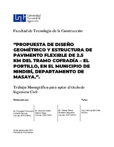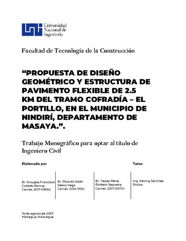 Collado Ramos, Douglas Francisco and Sáenz Vega, Ricardo Adán and Robleto Sequeira, Yasser Rene (2023) Propuesta de diseño geométrico y estructura de pavimento flexible de 2.5 km del tramo cofradía – el portillo, en el municipio de Nindirí, departamento de Masaya. Other thesis, Universidad Nacional de Ingeniería.