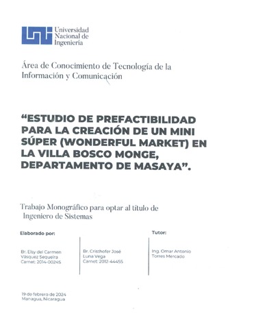 Vásquez Sequeira, Elsy del Carmen and Luna Vega, Cristhofer José (2024) Estudio de prefactibilidad para la creación de un mini Super (Wonderful Market) en la Villa Bosco Mongue, departamento de Masa. Other thesis, Universidad Nacional de Ingeniería.
