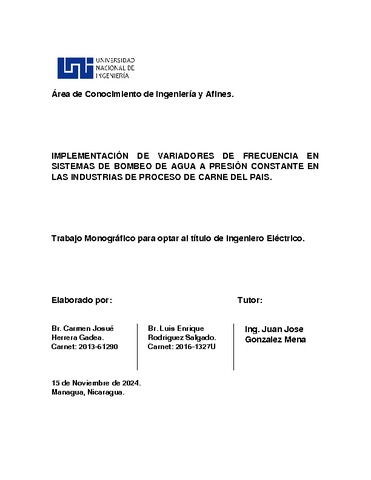| Uncontrolled Keywords: | Variadores de frecuencia (VFD); Automatización industrial; Sistemas de bombeo de agua; Control de presión constante; Electrónica de potencia. |
