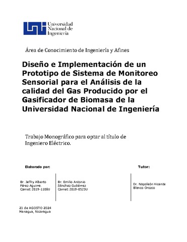 Pérez Aguirre, Jeffry Alberto and Sánchez Gutiérrez, Emilio Antonio (2024) Diseño e Implementación de un Prototipo de Sistema de Monitoreo Sensorial para el Análisis de la Calidad del Gas Producido por el Gasificador de Biomasa de la Universidad Nacional de Ingeniería. Other thesis, Universidad Nacional de Ingeniería.