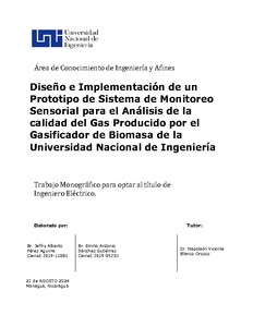 El documento presenta el diseño e implementación de un prototipo de sistema de monitoreo sensorial para analizar la calidad del gas producido por el gasificador de biomasa de la Universidad Nacional de Ingeniería (UNI). El sistema integra sensores de concentración de gases (como CO, CO₂, CH₄, H₂), temperatura y flujo, así como una interfaz de adquisición y procesamiento de datos. La información recolectada permite evaluar en tiempo real el desempeño del gasificador y la composición del gas producido, facilitando la optimización del proceso de gasificación. El proyecto combina conocimientos de electrónica, instrumentación, energía renovable y automatización, contribuyendo a la mejora de la eficiencia energética y la sostenibilidad de las investigaciones en la UNI.