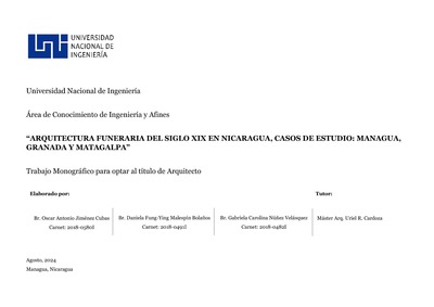 Jiménez Cubas, Oscar Antonio and Malespín Bolaños, Daniela Fung-Ying and Núñez Velásquez, Gabriela Carolina (2024) Arquitectura funeraria del siglo XIX en Nicaragua, casos de estudio: Managua, Granada y Matagalpa. Other thesis, Universidad Nacional de Ingeniería.