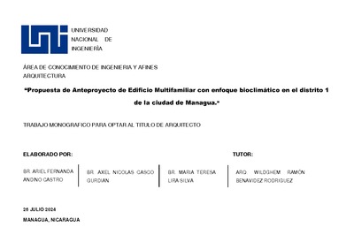 Andino Castro, Ariel Fernanda and Casco Guardian, Axel Nicolas and Lira Silva, María Teresa (2024) Propuesta de Anteproyecto de edificio Multifamiliar con enfoque bioclimático en el distrito 1 de la ciudad de Managua. Other thesis, Universidad Nacional de Ingeniería.