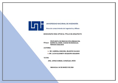 Zeledón Salinas, Gabriela Massiel and Sequeira Sequeira, Lucia Elizabeth (2024) Propuesta de renovación urbana del barrio del Bóer, ciudad de Managua, periodo 2022-2036. Other thesis, Universidad Nacional de Ingeniería.