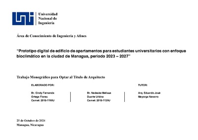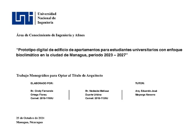 Ortega Flores, Cindy Fernanda and Duarte Urbina, Nadeska Melissa (2024) Prototipo digital de edificio de apartamentos para estudiantes universitarios con enfoque bioclimático en la ciudad de Managua, periodo 2023 – 2027. Other thesis, Universidad Nacional de Ingeniería.