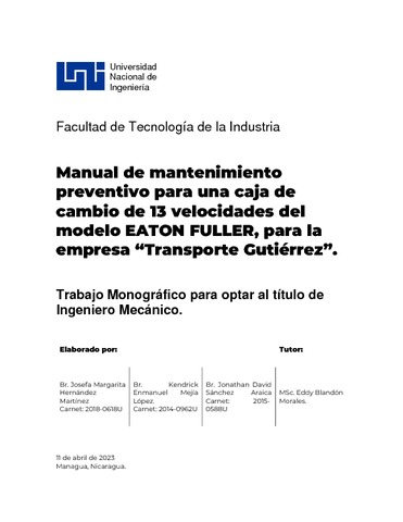 Hernández Martínez, Josefa Margarita and Mejía López., Kendrick Enmanuel and Sánchez Araica, Jonathan David (2023) Manual de mantenimiento preventivo para una caja de cambio de 13 velocidades del modelo EATON FULLER, para la empresa “Transporte Gutiérrez”. Other thesis, Universidad Nacional de Ingeniería.