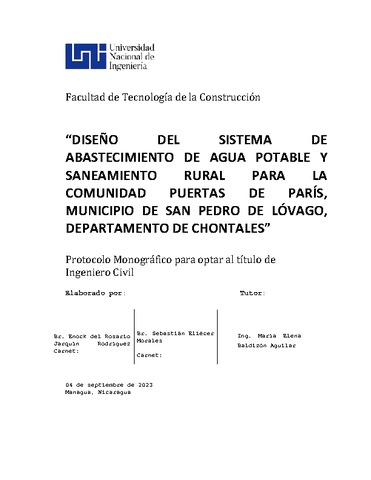 Jarquín Rodríguez, Enock del Rosario and Morales, Sebastián Eliécer (2023) Diseño del sistema de abastecimiento de agua potable y saneamiento rural para la comunidad puertas de parís, municipio de san pedro de Lóvago, departamento de Chontales. Other thesis, Universidad Nacional de Ingeniería.