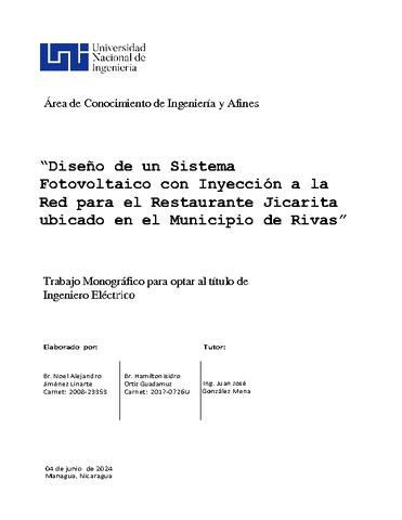 Jiménez Linarte, Noel Alejandro and Ortiz Guadamuz, Hamilton Isidro (2024) Diseño de un Sistema Fotovoltaico con Inyección a la Red para el Restaurante Jicarita ubicado en el Municipio de Rivas. Other thesis, Universidad Nacional de Ingeniería.
