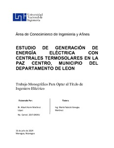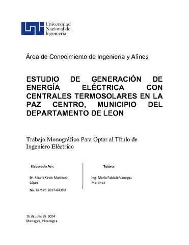 Martínez López, Albert Kevin (2024) Estudio de generación de energía eléctrica con centrales termosolares en la paz centro, municipio del departamento de León. Other thesis, Universidad Nacional de Ingeniería.
