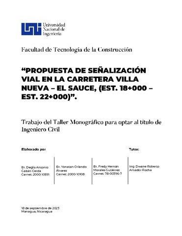 Gaitán Cerda, Deglis Antonio and Álvarez, Yonatan Orlando and Morales Gutiérrez, Fredy Hernán (2023) Propuesta de señalización vial en la carretera villa nueva – El Sauce, (EST. 18+000 –EST. 22+000). Other thesis, Universidad Nacional de Ingeniería.