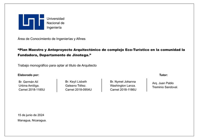 Urbina Arróliga, Germán Alí and Galeano Téllez, Keyli Lisbeth and Washington Lanza, Nymet Johanna (2024) Plan Maestro y Anteproyecto Arquitectónico de complejo Eco-Turístico en la comunidad la Fundadora, Departamento de Jinotega. Other thesis, Universidad Nacional de Ingeniería.