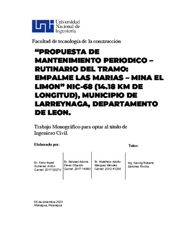 Esta monografía presenta una propuesta técnica de mantenimiento periódico y rutinario para el tramo carretero Empalme Las Marías – Mina El Limón (NIC-68), con una longitud de 14.18 km, ubicado en el municipio de Larreynaga, departamento de León. El estudio incluye el diagnóstico del estado actual de la vía, la identificación de deterioros, el cálculo de volúmenes de obra, y la definición de actividades de mantenimiento preventivo y correctivo, con el propósito de prolongar la vida útil del pavimento y optimizar los recursos disponibles. La propuesta se basa en los lineamientos del Ministerio de Transporte e Infraestructura (MTI) y en buenas prácticas de conservación vial aplicables al contexto nicaragüense.