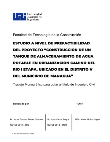 Robles Obando, Hazel Tamara and Roque, Juan Carlos (2023) Estudio a nivel de prefactibilidad del proyecto “construcción de un tanque de almacenamiento de agua potable en urbanización camino del Rio I etapa, ubicado en el distrito V del municipio de Managua. Other thesis, Universidad Nacional de Ingeniería.