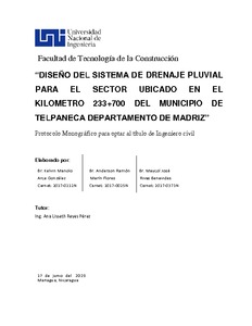 Arce González, Kelvin Manolo and Marín Flores, Anderson Ramón and Rivas Benavides, Maycol José (2023) Diseño del sistema de drenaje pluvial para el sector ubicado en el kilómetro 233+700 del municipio de Telpaneca departamento de Madriz. Other thesis, Universidad Nacional de Ingeniería.