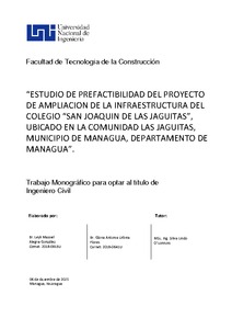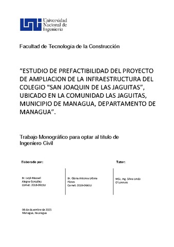 Algeria González, Leyli Massiel and Urbina Flores, Gloria Antonia (2023) Estudio de prefactibilidad del proyecto de ampliación de la infraestructura del colegio “San Joaquín de las Jaguitas”, ubicado en la comunidad las Jaguitas, municipio de Managua, departamento de Managua. Other thesis, Universidad Nacional de Ingeniería.