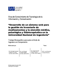 Calderon Orozco, Michelle Scarleth and Pineda Joseph, Luis Miguel and Reyes Moreno, Engel Gabriel (2025) Desarrollo de un sistema web para la gestión de inventario de medicamentos y la atención médica, psicológica y fisioterapéutica en la Universidad Nacional de Ingeniería. Other thesis, Universidad Nacional de Ingeniería.