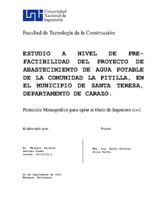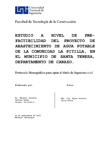 Sánchez Román, Maryann Xaviera (2023) Estudio a nivel de prefactibilidad del proyecto de abastecimiento de agua potable de la comunidad la pitilla, en el municipio de santa teresa, departamento de Carazo. Other thesis, Universidad Nacional de Ingeniería.