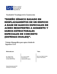 Miranda Quiros, Nadja Thais and Portillo Arce, Carlos Adolfo (2023) Diseño sísmico basado en desplazamientos de un edificio a base de marcos especiales de acero resistentes a momento y muros estructurales especiales de concreto (Sistemas Duales). Other thesis, Universidad Nacional de Ingeniería.