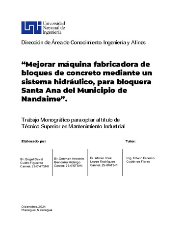 Guido Figueroa, Engel David and Bendaña Hidalgo, German Antonio and López Rodríguez, Abner José (2024) Mejorar máquina fabricadora de bloques de concreto mediante un sistema hidráulico, para bloquera Santa Ana del Municipio de Nandaime. Project Report. Universidad Nacional de Ingeniería, Managua.
