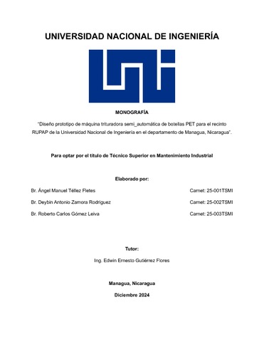 Téllez Fletes, Ángel Manuel and Zamora Rodríguez, Deybin Antonio and Gómez Leiva, Roberto Carlos (2024) Diseño prototipo de máquina trituradora semi-automática de botellas PET para el recinto RUPAP de la Universidad Nacional de Ingeniería en el departamento de Managua, Nicaragua. Project Report. Universidad Nacional de Ingeniería, Managua.
