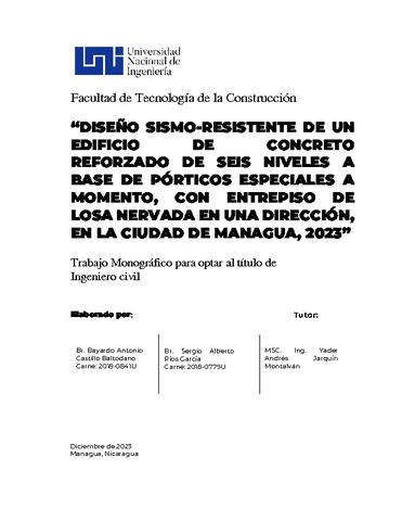 Castillo Baltodano, Bayardo Antonio and Ríos García, Sergio Alberto (2023) Diseño sismo-resistente de un edificio de concreto reforzado de seis niveles a base de pórticos especiales a momento, con entrepiso de losa nervada en una dirección, en la ciudad de Managua, 2023. Other thesis, Universidad Nacional de Ingeniería.