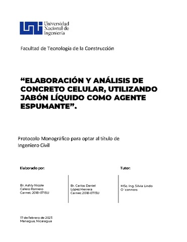 Calero Romero, Ashly Nicole and López Herrera, Carlos Daniel (2023) Elaboración y análisis de concreto celular, utilizando jabón líquido como agente espumante. Other thesis, Universidad Nacional de Ingeniería.
