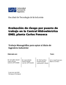 Castro Morán, Jennyfers Sarahí and Rivera Vargas, Laura Evelia and Rugama Aviléz, Darling Eliza (2023) Evaluación de riesgo por puesto de trabajo en la Central Hidroeléctrica ENEL planta Carlos Fonseca. Other thesis, Universidad Nacional de Ingeniería.