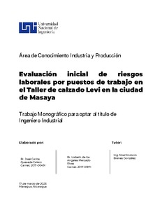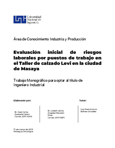 Quesada Calero, José Carlos and Mercado Rivas, Lisbeth de los Ángeles (2025) Evaluación inicial de riesgos laborales por puestos de trabajo en el Taller de calzado Levi en la ciudad de Masaya. Other thesis, Universidad Nacional de Ingeniería.