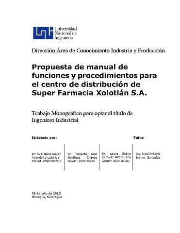 Avendaño Loáisiga, Axel René Junior and Martínez Chávez, Roberto José and Ramírez Altamirano, Laura Seline (2025) Propuesta de manual de funciones y procedimientos para el centro de distribución de Súper Farmacia Xolotlán S.A. Other thesis, Universidad Nacional de Ingeniería.